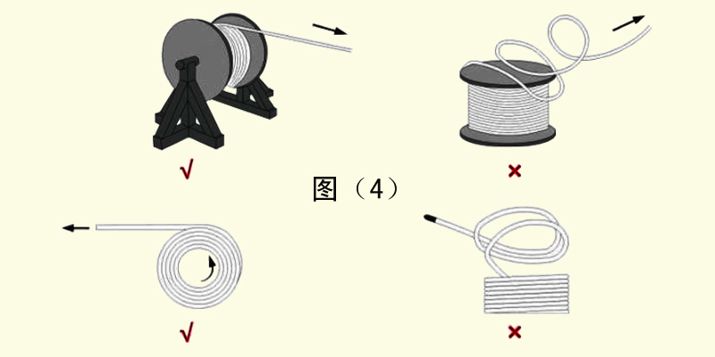 5、拖鏈電纜在敷設中不能扭曲,即不可直接從電纜卷筒或電纜盤上拉出,而應旋轉短筒或者電纜盤將電纜展開。如圖(4)